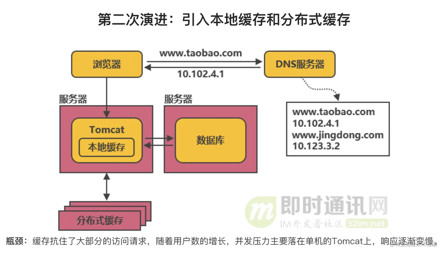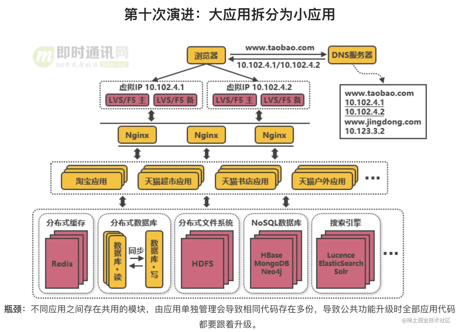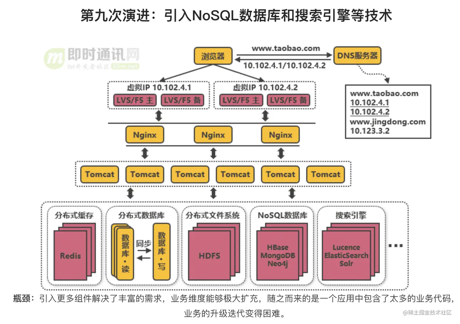 我们将淘宝网的架构演进(即时通讯网)整理到一个滑动图里,如下图所示: