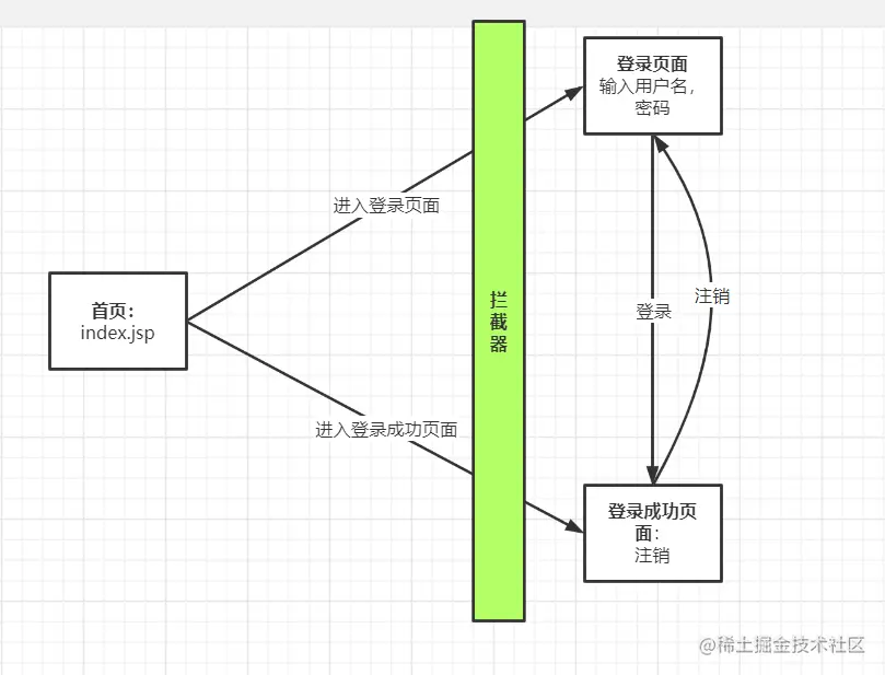 - 根据springmvc.xml里关于拦截器的配置,对所有请求都进行了拦截。然后根据条件判断是否放行。
