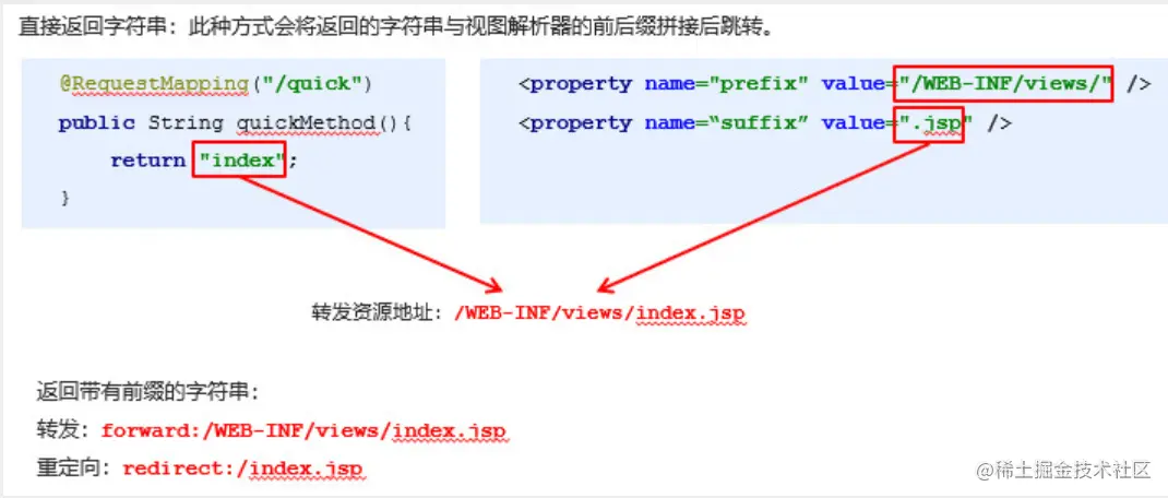 <!--配置注解扫描 ,让其扫描controller下的注解--> <context:component-scan base-package="com.itheima"/> <!-- 配置视图解析器,对Controller类中返回的字符串进行解析,在其前面加上/WEB-INF/jsp/,后面加上.jsp --> <!--这样才能使DispatchServlet找到index.jsp的具体位置,而不是一个代表文件名字的字符串 --> <bean class="org.springframework.web.servlet.view.InternalResourceViewResolver"> <property name="viewClass" value="org.springframework.web.servlet.view.JstlView" /> <property name="prefix" value="/WEB-INF/jsp/" /> <property name="suffix" value=".jsp" /> </bean> -