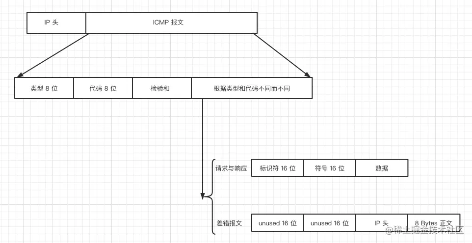 ICMP 处于网络层,负责进行网络的侦测,以及对发出的请求返回的信息带回,其中利用了类型(Type)、代码(Code)进行区分不同的 ICMP 报文。Ping 程序是典型的基于 ICMP 协议实现的程序。