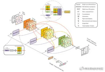 为了解决现有方法的局部信息保留能力和泛化能力不足的问题,这篇文章从损失函数和模型架构两个方面进行了改进,提出了模型 LPD-GCN。众所周知,GCNs 通过利用图的拓扑结构和节点特征来学习整个图的图级表示。从损失的角度来看,为了充分利用和学习节点的特征信息,LPD-GCN 构造了额外的局部节点特征重构任务,以提高隐藏节点表示的局部表示能力并增强最终图级表示的判别能力。也就是额外增加了一个辅助约束来保留图的局部信息。这个节点特征重构任务是通过设计一种简单但有效的编码-解码机制来实现的,其中将堆叠的多个图卷积层当作编码器,然后添加一个多层感知器(MLP)用于后续的解码。这样的话,就可以将输入的节点特征通过编码器嵌入到隐藏表示中,然后将这些向量表示再输入到解码器中以重构初始节点特征。从模型架构的角度来看,首先探索并设计了一个稠密连接的图卷积架构来建立不同层之间的连接关系,以灵活充分地利用来自不同位置的邻域的信息。具体地说,将每个卷积层及其对应的读出模块与所有先前的卷积层相连。