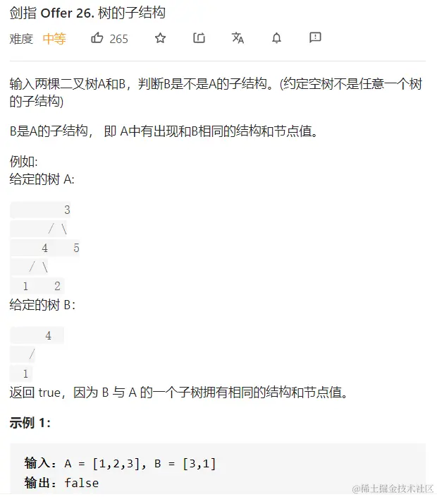 - 第二个递归则用于进行遍历,如果A树为空,说明A数遍历完了都没有匹配到,说明B树不是子树,如果B树为空,说明B树遍历完了,说明B树是子树,如果A和B的值不相同,则返回false,此时也许会有疑问,那万一子结构在树的深部岂不是直接返回false了?这是第一个递归就开始发挥作用了。