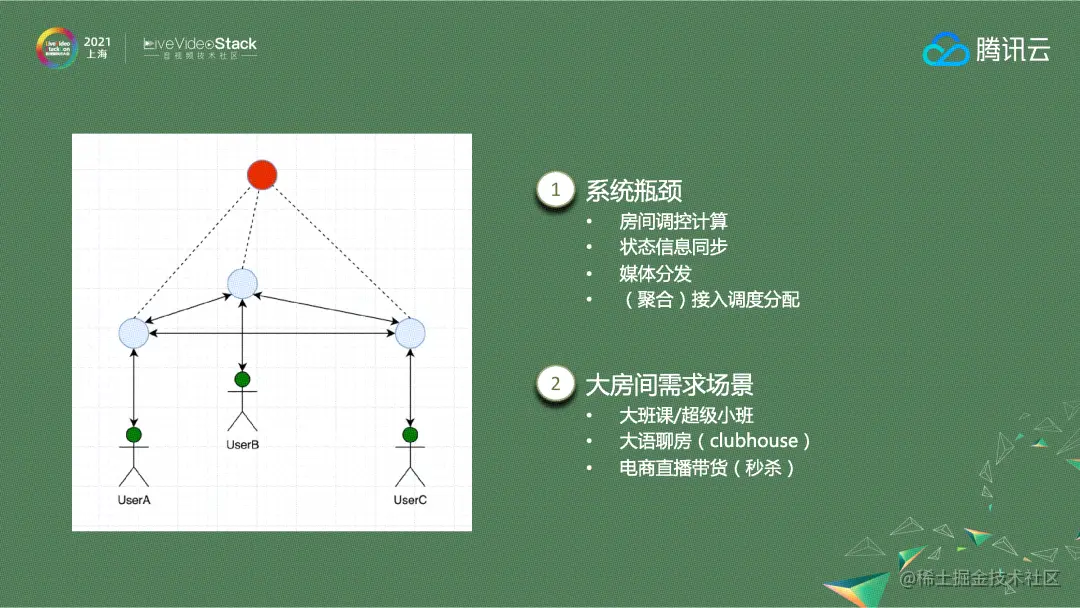说到规模问题,最开始讲到的多人音视频通话系统是基于小房间的SFU架构,在房间人数变多的时候会有一个系统瓶颈。首先是调控的计算和状态信息的同步,这两个是落在一台机的一个进程上完成的,当人数非常多的时候,运算量也越来越大,瓶颈就非常明显。第二点,媒体传输采用单层分发结构,当房间人数越来越大,节点越来越多的时候,带宽就会产生很明显的瓶颈。最后,为了减少内网穿越,接入调度采用了聚合分配的策略,同房间、同运营商、同地区的用户会优先分到同一台机器上,分满了再分下一台。当房间人数很多,短时间内一起进房的时候,服务的数据上报和状态同步可能更新不及时,导致节点超分。但随着RTC技术场景的拓展,很多客户有10万人大房间的需求,如教育场景大班、超级小班课,大的语聊房以及电商直播带货等,所以针对客户需求对原始架构做了升级改造。