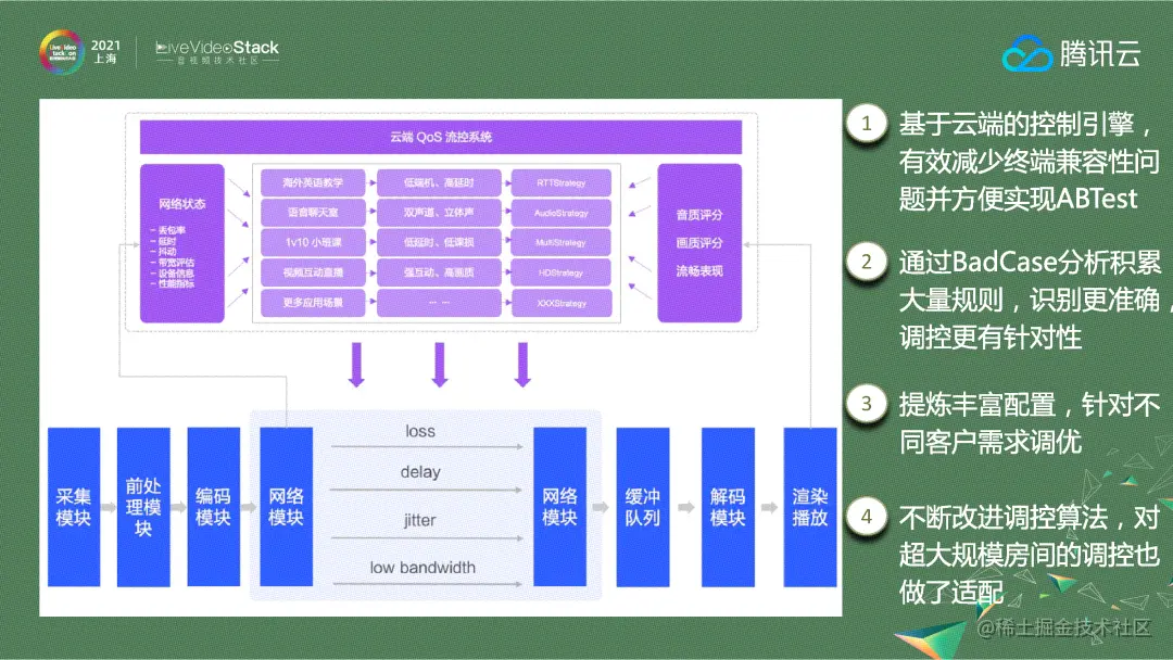 在调控方面,我们开发了一个基于云端的控制引擎。把控制系统放在云端的好处是可以减少终端版本的兼容性问题,并且比较方便进行算法AB-Test的效果验证。第二点是在运营过程中,我们通过BadCase分析积累大量的规则,这样对场景的识别更加准确,让调控更有针对性。与此同时,我们在规则模型中提炼出丰富的配置参数,针对不同客户需求进行调优。比如有的通话产品客户希望流畅优先,而有的直播客户需要清晰优先模式,这些需求都可以通过调整配置来实现。此外,我们在不断改进算法。在BBR出来的时候,我们参考了BBR带宽预测的方式,对超大规模房间的调控也做了适配。