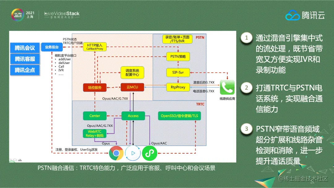由于上述问题,我们采用了混音引擎,通过混音引擎将流做集中式的处理,既节省带宽、又方便实现IVR和录制功能,打通TRTC与PSTN电话系统,实现融合通信能力。我们还与腾讯会议合作,做了PSTN窄带语音频域超分扩展和线路杂音检测和消除,进一步提升通话质量,PSTN的融合通信能力是TRTC的特色功能,广泛应用于客服、呼叫中心和会议场景等。