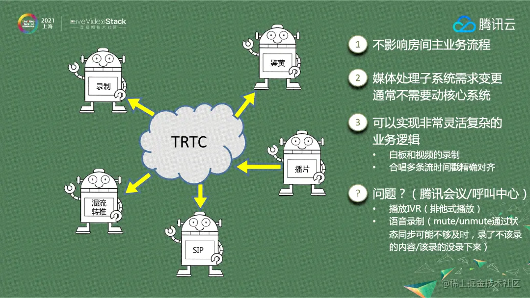 最后向大家探讨关于RTC平台的媒体处理子系统。RTC的媒体处理子系统——比如录制、鉴黄、播片、混流转推等,本质上是一个旁路系统,现在业界通用的做法是让一个linux sdk机器人模拟进房,把流拉到服务器本地,做出处理之后再转旁路出去。Linux sdk机器人模拟进房不会影响两个房间的主业务流程。媒体处理子系统需求变更通常不需要动核心系统,且可以实现非常灵活复杂的业务逻辑,比如需要做白板和视频的对齐、K歌的场景下可以把音频和时间戳精确对齐,通过这样的模式可以实现复杂度的隔离。但我们在做腾讯会议和呼叫中心的时候遇到两个难题。腾讯会议的场景需要打电话,最初的想法是用机器人进到房间之后把流拉回来,并转成g.711、g.729放到PSTN网络中就可以了。由于播放IVR是全房广播或是针对一个人单独广播,所以IVR需要排他式的播放,在SFU的转发架构下不太容易做精确控制,不管是对新进的控制、还是媒体的识别都是比较复杂、难以控制的。此外,语音录制的情况下,金融行业的客户是不能接受在录制过程中有多录或是少录几个字的情况的,就像在念身份证号时少几位数字是绝对不可以的。但是系统中如果是采用机器人的方式去做,由于是两个系统的整合,系统之间会出现抖动、延迟,就导致录了不该录的内容或者该录的没录下来,这些情况对于较为苛刻的用户是绝对不可以接受的。