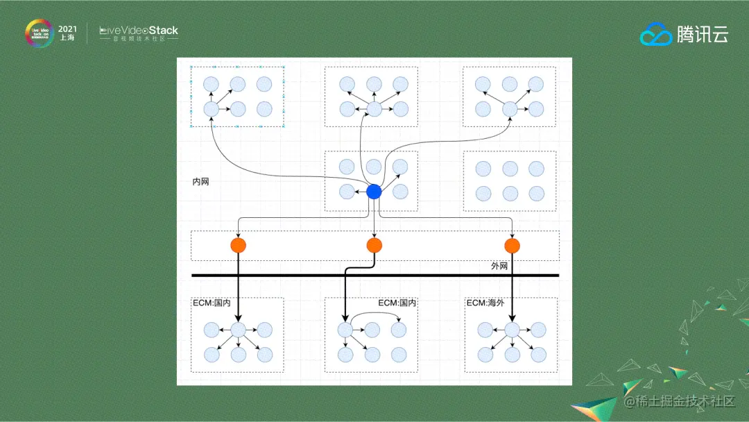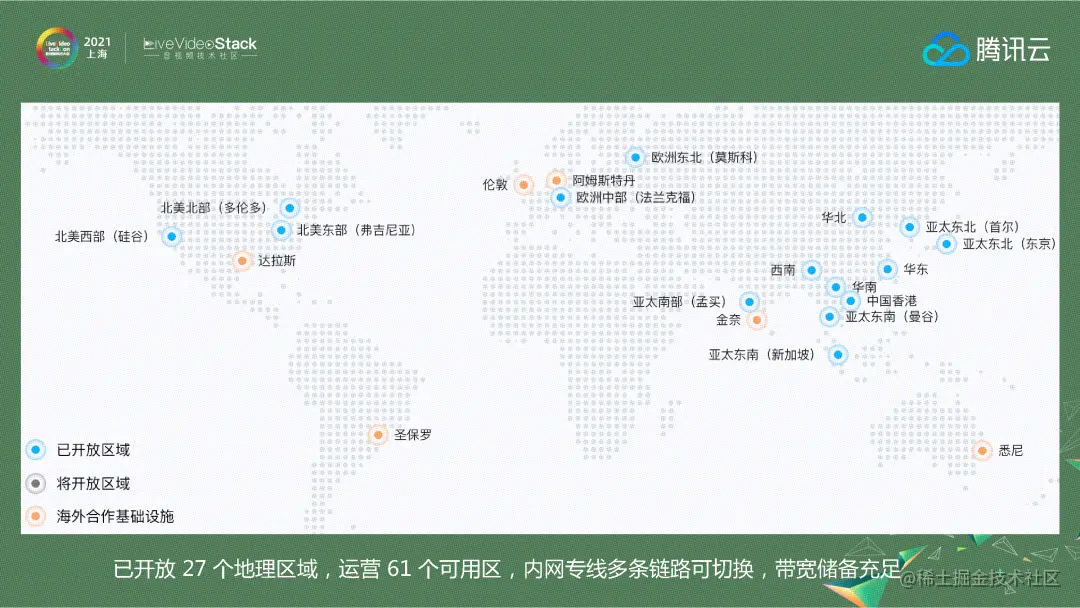 内网传输部分是通过腾讯云的云联网来实现的,腾讯云目前已经在全球开放27个地理区域、61个可用区,内网专线有多条链路可切换,带宽储备充足。在腾讯会议做高级别会议汇报的时候也经常做切换演练,几条专线可以互相切,实际应用下来内网质量整体比较稳定。