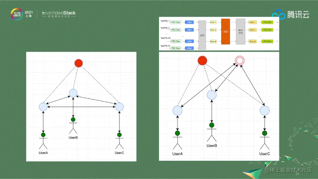 当时我们的产品还有一个特点——开视频的比例不高,反而纯音频房间非常活跃。我印象比较深刻的一个案例,一款热门游戏新出皮肤之后,语音房间的人数就会暴涨,这也是因为很多玩家使用QQ多人语音来开黑。基于这种现象以及成本考虑,我们开发了一个混音引擎。当房间人数超过成本线,我们就会把流都转到混音引擎,由混音引擎根据音量选路、混音重新编码后,再把流推到下行的媒体平台。它的架构已经不是典型的SFU,而很像MCU ,虽然当时的出发点在于成本节约,但这为我们后来做腾讯会议和云呼叫中心打下了良好的基础。