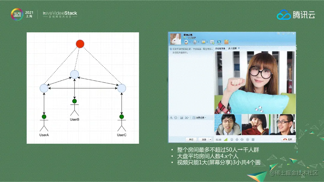大规模的视频会议现在变得越来越常见,比如腾讯会议从300方到企业版2000方,不久还会提供更大规模的会议产品形态。有些机构的大班课/超级小班课现在开始尝试使用RTC代替标准直播来提升上课体验,大房间场景未来也会越来越多。