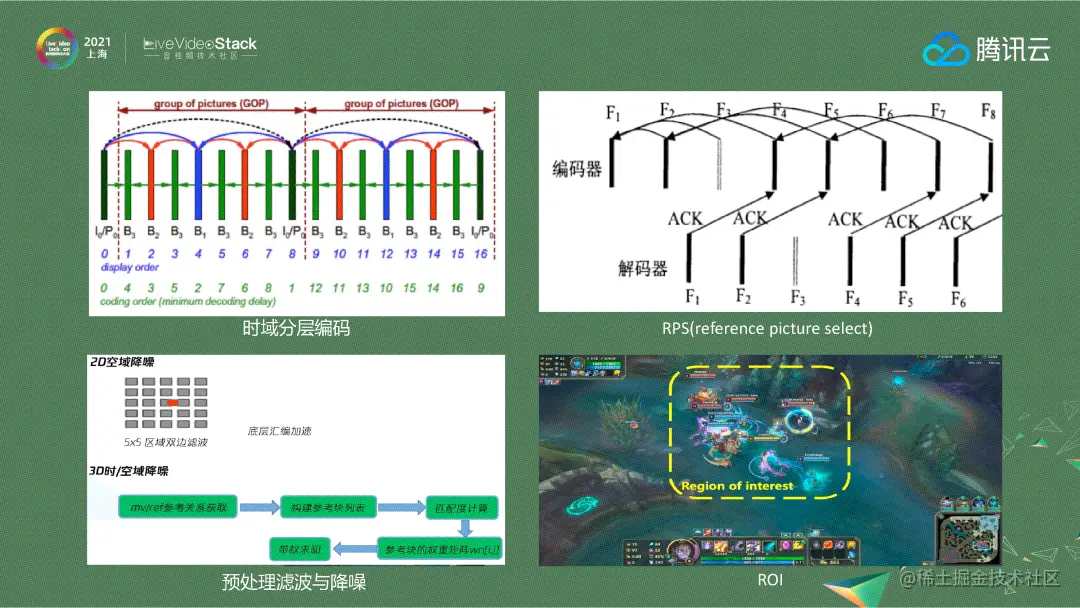 在视频方面,我们采用时域分层编码来应对下行限带宽场景。一般直播产品在处理下行限带宽场景时,通常采用转码的方式——将原始码流转码出多种规格的流(原始流、高清、标清),根据不同网络质量切换不同的流。但RTC由于延时和成本考虑,一般不做房间内转码,所以我们需要在编码时把GOP内的帧序列进行分层,带宽超了的时候,选择丢弃一些增强层的帧、保留基础层的帧,同时对基础层的帧增加额外的冗余保护,以此来保障用户观看体验。另一个经常和时域分层编码搭配使用的是RPS跨帧参考。RPS的策略是只有被接收端ACK确认过的帧才作为参考帧,这是通过牺牲一定画质来保障流畅性的策略。为了尽量减小画质损失,我们还设计了多种不同的参考模型来适配不同的网络情况。比如网络质量很好的时候,我们预测后面2-3帧大概率能收到,此时就不完全参照ACK模式,编码器在GOP的小分组内依然就近参考,从而保障清晰度;当网络质量下降时,我们会根据网络情况切换不同档位的模型,减少就近参考的数量;当网络持续变差的时候,我们才会严格按照ACK确认执行。在编码效率方面,我们在编码之前会进行一定程度的滤波和降噪处理,这样编码的压缩率会有很好的提升,也能比较好的提升带宽。在资源有限的情况下,我们还会采用ROI把有限的码率倾斜到用户更感兴趣的区域。