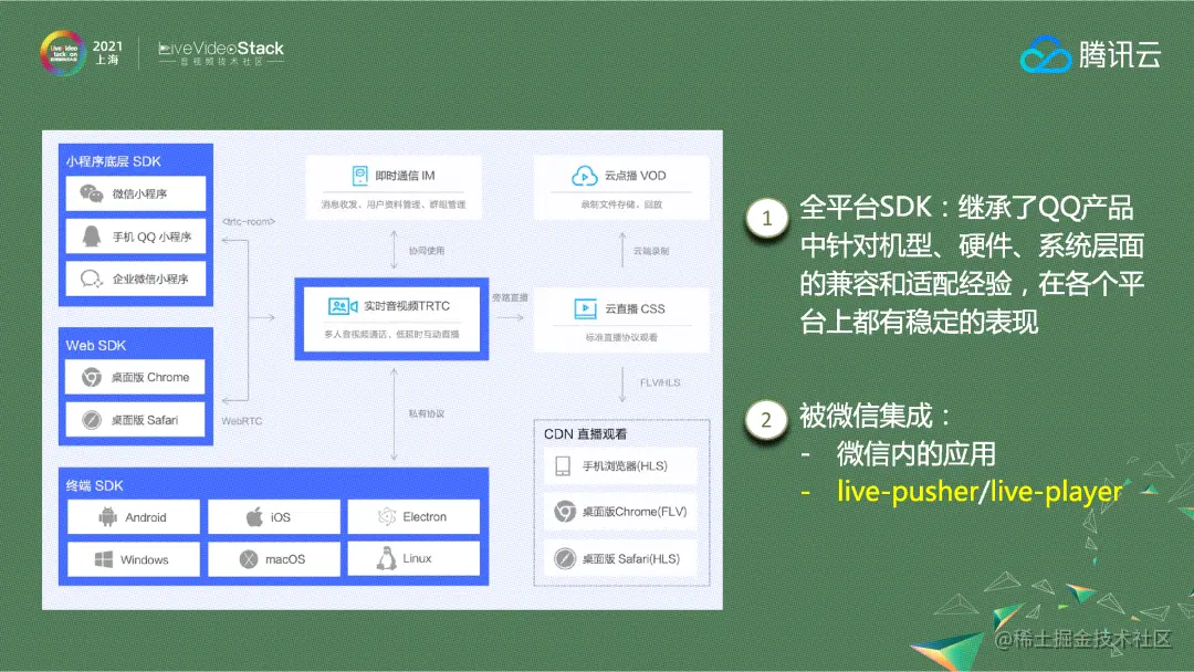 腾讯云实时音视频产品-TRTC,是在QQ多人音视频平台的基础上,针对To B场景深度优化改造之后推出的云PaaS服务。首先它提供了全平台SDK,这个SDK继承了QQ海量服务过程中,所针对的机型、硬件、系统层面的兼容和经验配置,它在各个平台上都有比较稳定的表现。其次这个SDK已经被集成到微信中,目前微信视频号直播、微信群直播和企业微信都用了TRTC-SDK和后台服务。外部客户也可以通过小程序的live-pusher和live-player两个标签来实现小程序和原生应用之间的高质量互通。在媒体的处理方面,我们和腾讯云多媒体实验室、腾讯会议天籁实验室以及QQ和微信都保持非常紧密的合作。在腾讯会议、QQ和微信里应用比较成熟的技术也都会被引入到TRTC中。