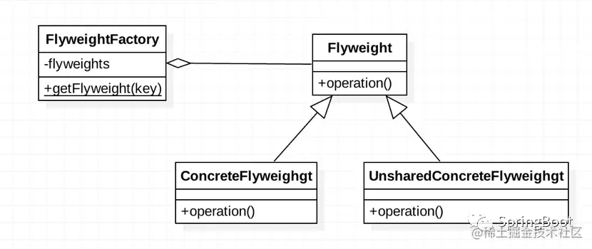 (2)ConcreteFlyweight是具体享元角色,是具体的产品类,实现抽象角色定义的业务;UnsharedConcreteFlyweight是不可共享的享元角色,一般不会出现在享元工厂中;