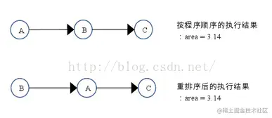 A和C之间存在数据依赖关系,同时B和C之间也存在数据依赖关系。因此在最终执行的指令序列中,C不能被重排序到A和B的前面(C排到A和B的前面,程序的结果将会被改变)。但A和B之间没有数据依赖关系,编译器和处理器可以重排序A和B之间的执行顺序。下图是该程序的两种执行顺序: