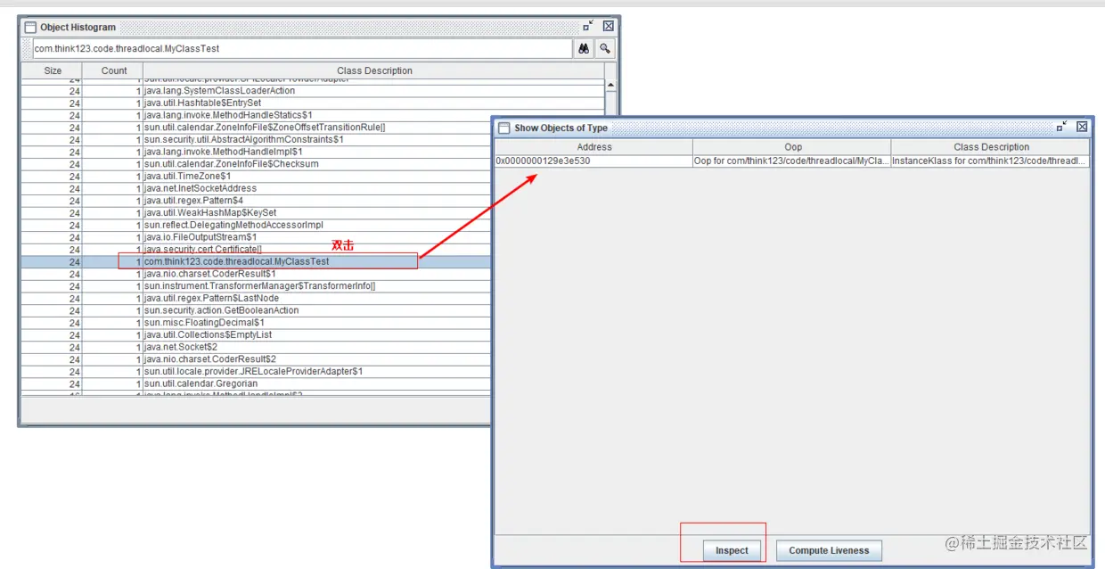 此时我们可以查看main线程的oop以及线程堆栈,在堆栈中可以看到我们的MyClassTest对象分配到了年轻代,也可以看到对应的内存地址,然后把这个地址复制下来,我们可以通过