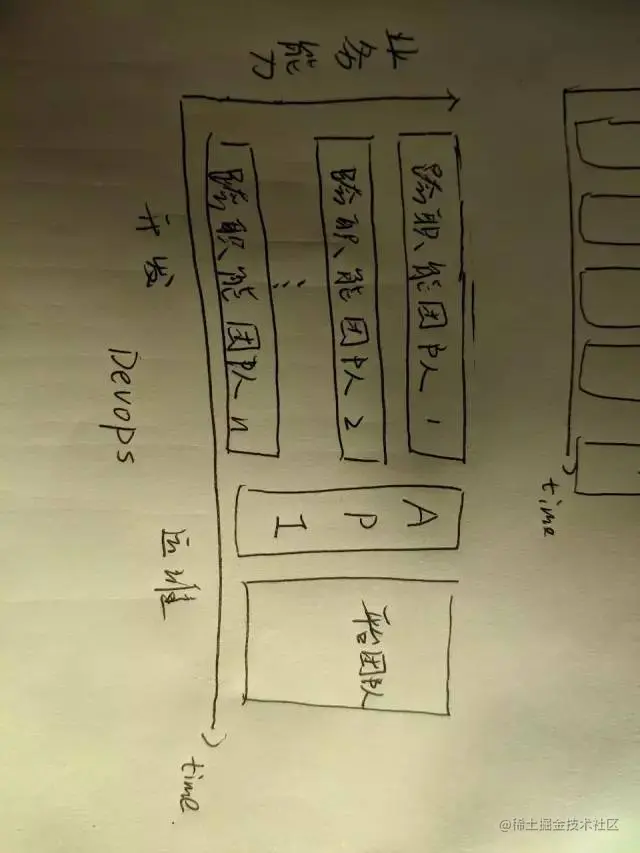 使用了微服务架构体系,团队组织方式需要转变成跨职能团队,即每个团队都有产品专家,策划专家,开发专家,运维专家,他们使用API方式发布他们的功能,而平台使用他们的功能发布产品