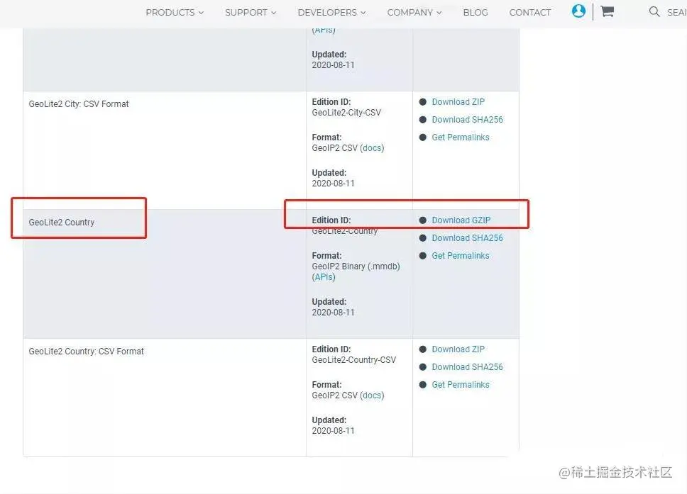 选择 GeoLite2 Country ,点击 Download GZIP 下载即可