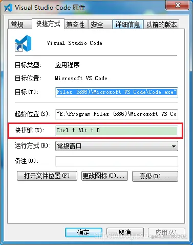 出现下图所示界面,手动设置一个快捷键,例如下图给 VS 设置的 Ctrl +Alt+D ,