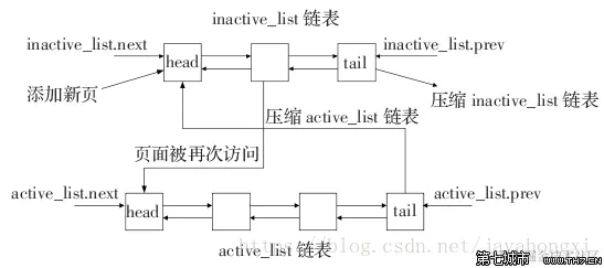 Linux会缓存尽量多的消息数据到内存中,提高读数据缓冲命中率。当内存不够时,还是要清理没用的数据,将清理的空间用以缓存新的内容,这整个过程,Linux用一个双向链表来管理,如下图: