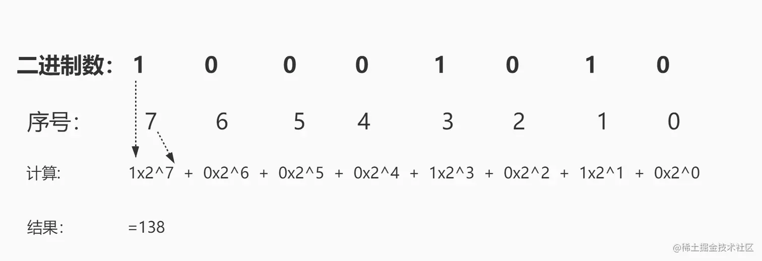 - 方法:从右往左的给二进制的每一位从0开始标上序号,将每一位的值乘以2(几进制就乘以几)的序号次方,并将每一位算出的结果加起来得到的数就是该二进制数的十进制表示。