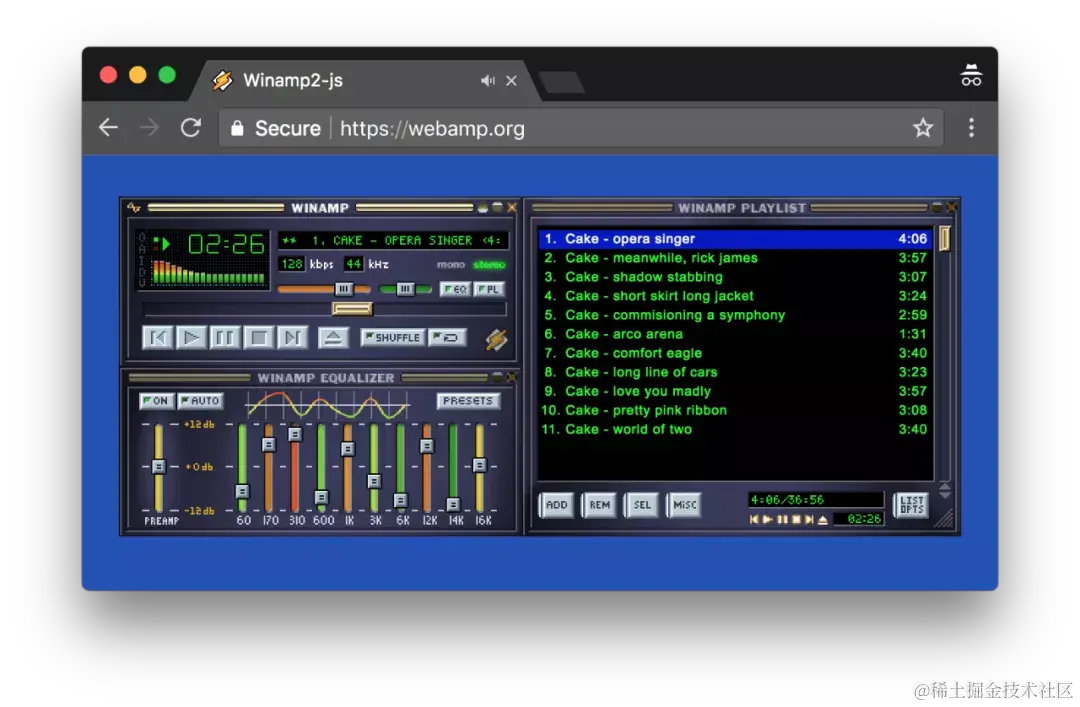Webamp 使用了HTML5 和 JavaScript 对 Winamp 2.9 进行了重新实现,Webamp 可以运行在现代浏览器上,包括 Edge、Firefox、Safari 和 Chrome,不支持 IE。