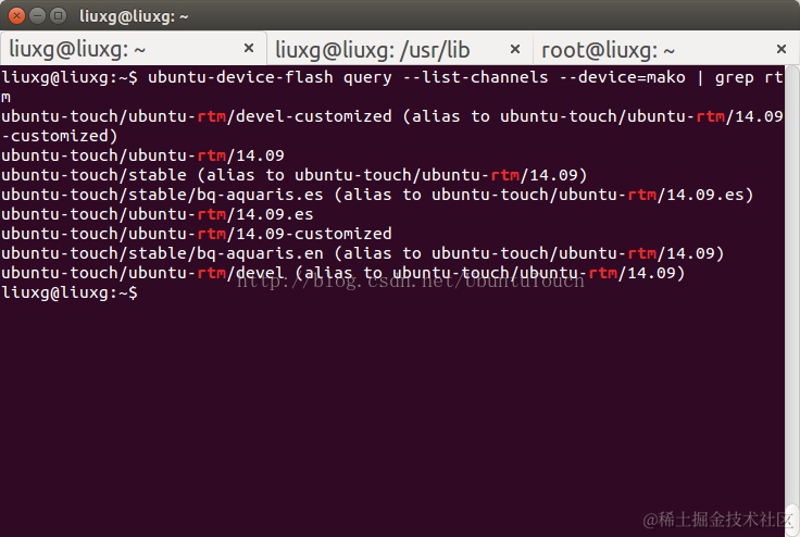 对MX 4的用户来说,我们必须确保我们的手机是解锁的才可以刷Ubuntu手机软件。从网上购买的Ubuntu手机,都是已经解锁过的。另外,我们必须像在上面介绍的那样,我们首先需要通过“ 怎么在Ubuntu手机中打开开发者模式”来打开我们的开发者模式。我们可以使用如下的命令来显示所有可以刷进MX 4的所有channel: