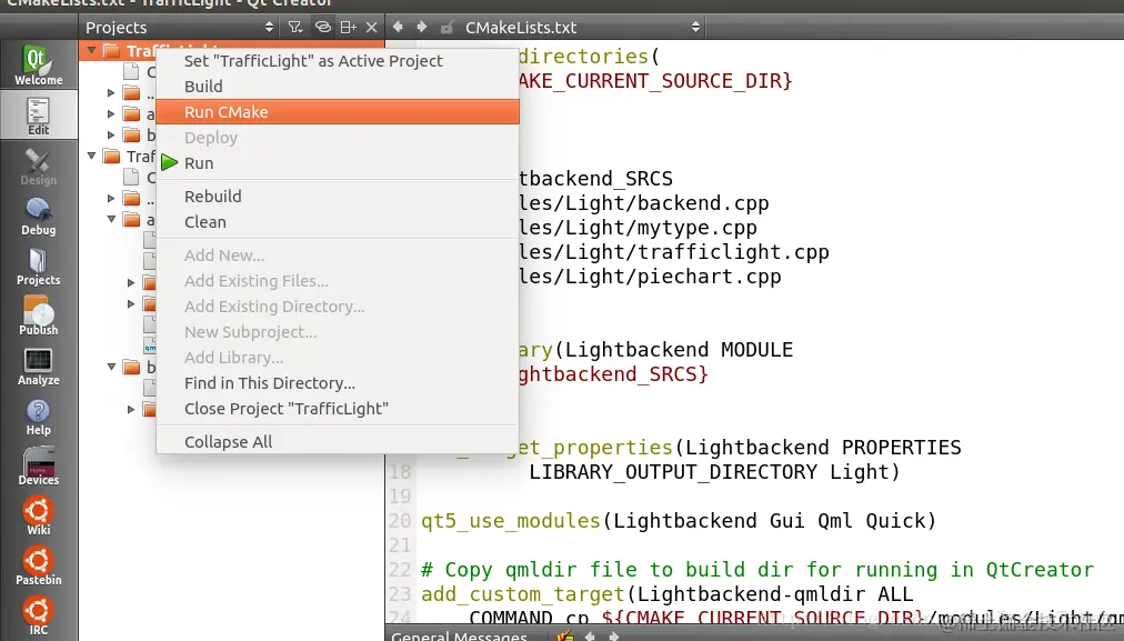 这时,我们可以关闭项目再打开项目,或者直接在项目框中点击右键,并运行“Run CMake”以使刚加入的文件在项目框中可见。
