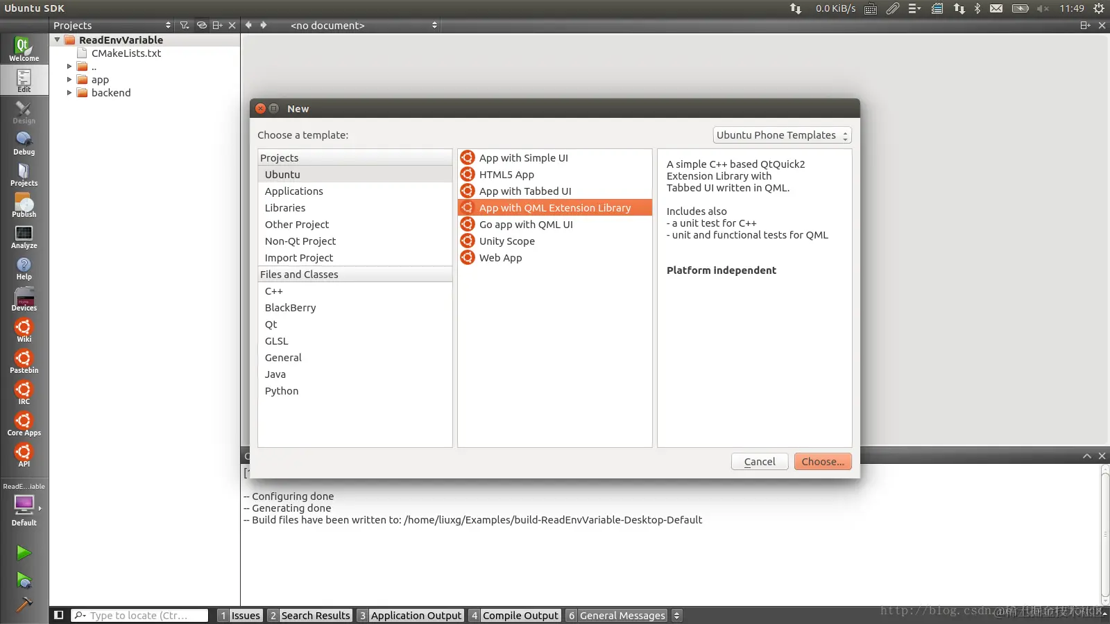 首先我们启动Qt Creator IDE,然后选择如下所示的template (App with QML extension Library):