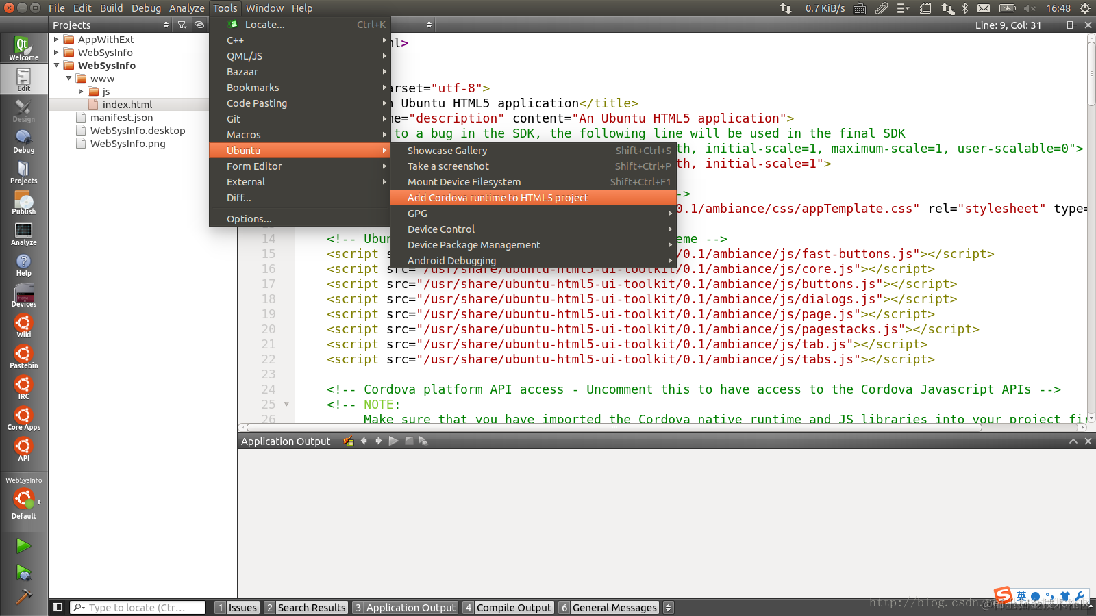 我们知道Cordova API有很多有用的功能。可以是我们的应用更加丰富。下面我们来学习怎么把 Cordova API加到我们的应用中去。首先,我们选中我们的项目,同时选择菜单“ Tool”==>"Ubuntu" ==>"Add Cordova runtime to HTML 5 project"。