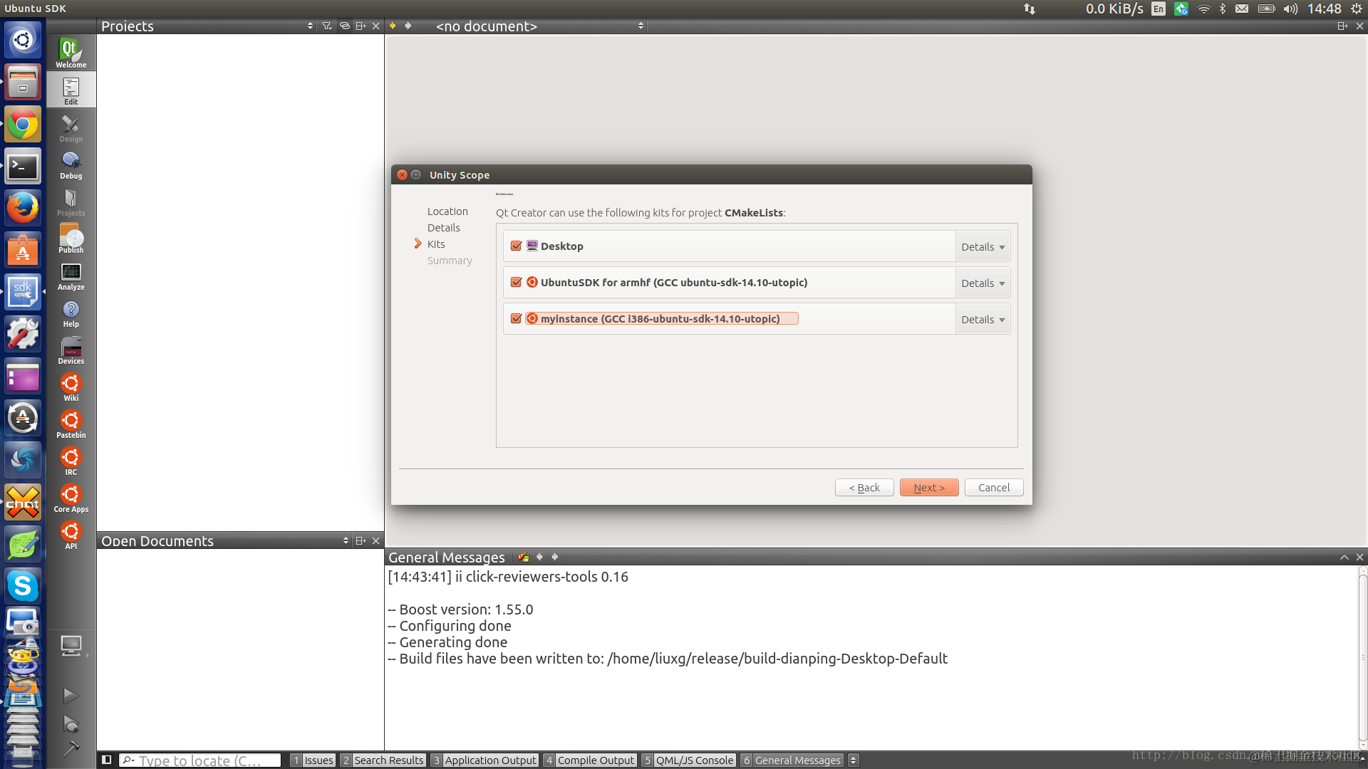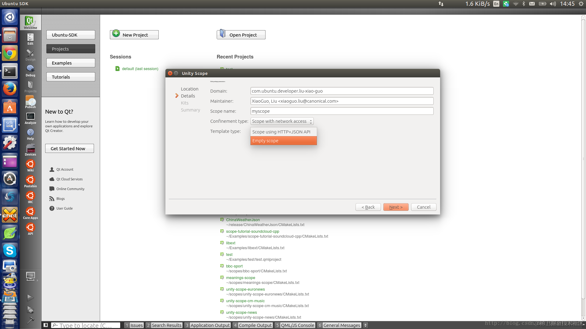 首先打开我们的Ubuntu SDK。选择“Unity Scope"模版。
