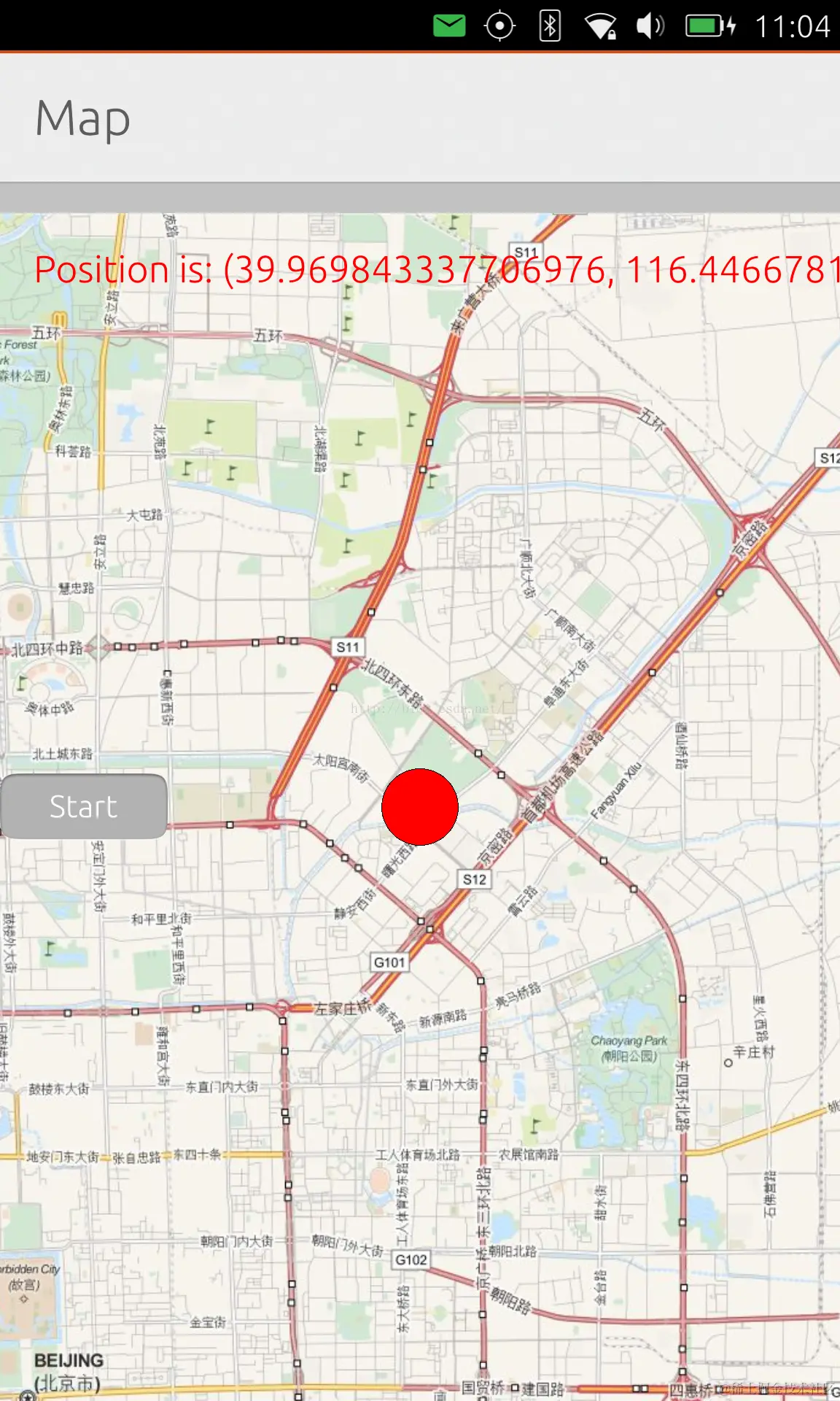 同时我们在Map里用红色的字体显示当前的位置。 运行的结果显示在如下的图中。我们可以改变zoomLevel来看不同的大小: