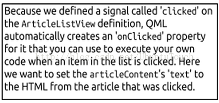 首先,我们必须在ArticleListView中每个item被点击时生成一个signal,并把这个signal连接到我们需要产生的动作。我们可以定义一个名叫"clicked"的signal。