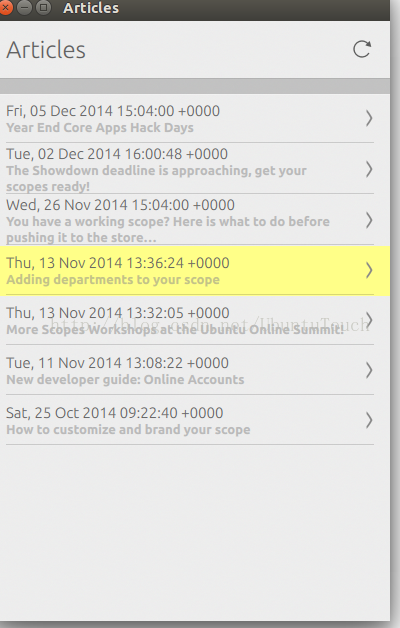 我们将用UbuntuListView来显示来自 developer.ubuntu.com的RSS 条目。UbuntuListView是继承于Qt中的ListView。但是它加入了一些新的一些feature。比如说pull-to-refresh。它也可以很方便地来搜索文字。下面我们来详细介绍如何做: