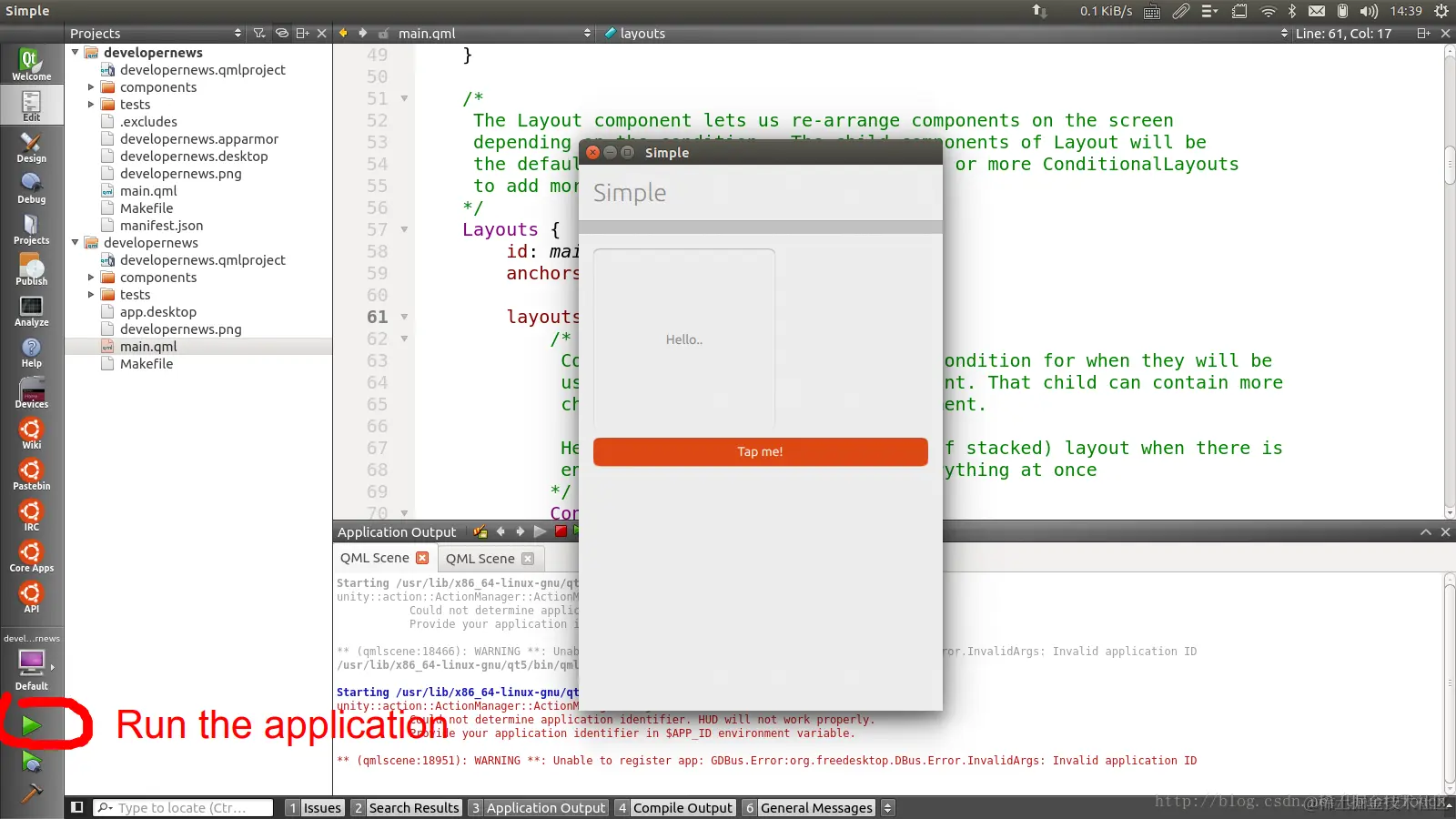在这里注意maintainer的格式。如果有红色的错误显示,查看一下在“ < ”的左边有没有留有一个空格。如果你还没有安装好自己的SDK的话,请参照文章“Ubuntu SDK 安装”来完成自己的安装。我们可以直接运行已经创建好的应用。为了显示的更像一个是一个手机的界面,我们直接把“main.qml"中的尺寸设置如下: