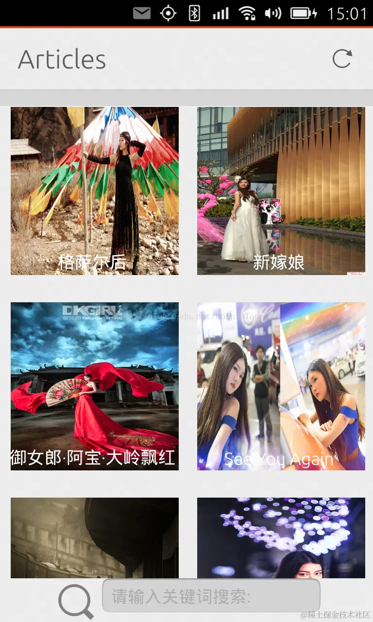 e) 终极挑战2: 还是利用上面的Pico RSS feed,修改我们的ListView为GridView: