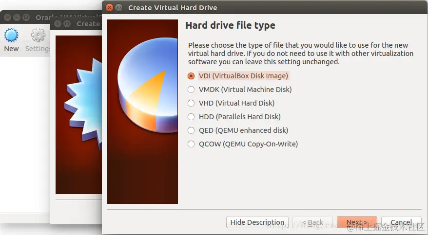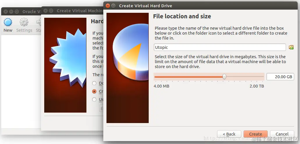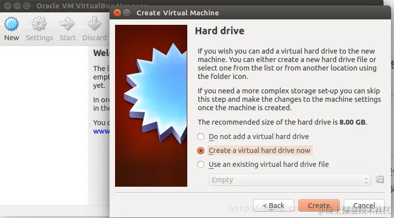 对于我们首次创建Ubuntu OS来说,我们选择“ Create a virtual hard drive now”。如果你曾经创建过,并存有一个virtual hard drive的文件,你可以直接选择“ Using an existing virtual hard drive file”。这样创建起来更块。