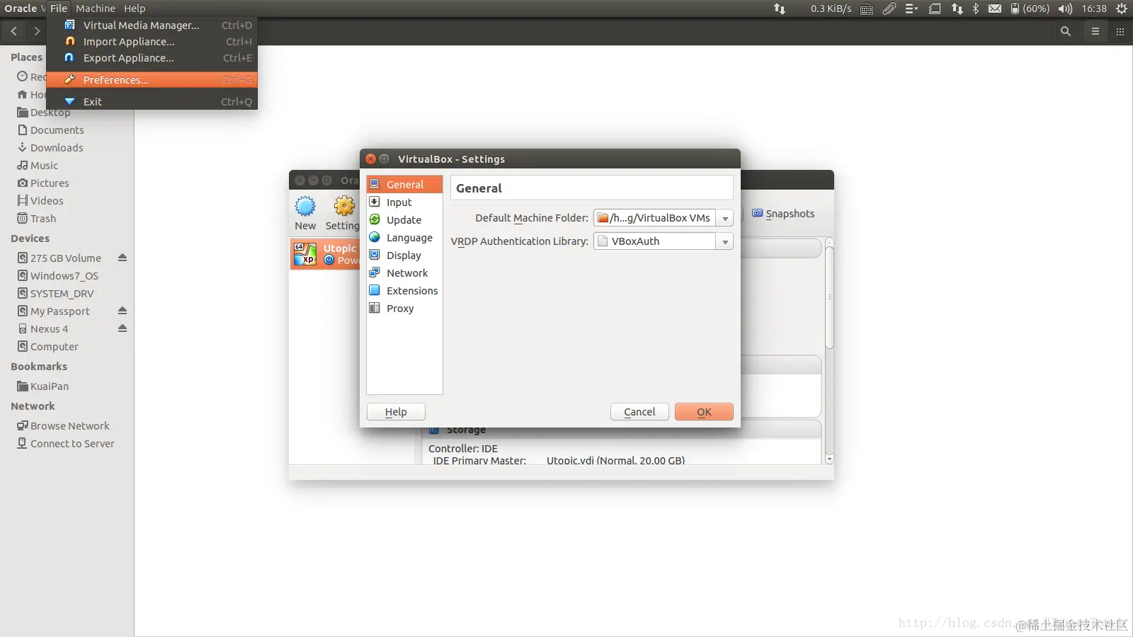 首先,我们关掉Ubuntu OS。打开VirtualBox,并点击菜单中的“ Preferences”: