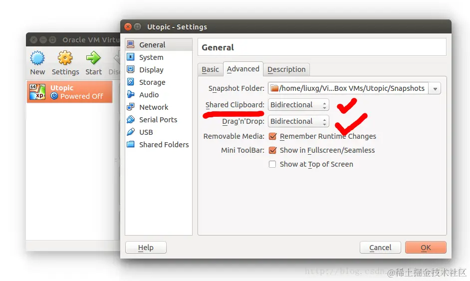 选择“ General”,我们可以设置可以在host及guest系统之间进行拷贝。这个对我们有时非常有用。