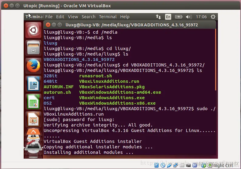 等安装完后,我们重新启动VM。我们就可以看到全屏的Ubuntu系统了。它的分辨率和Host的分辨率应该是一样的。另外,如果在任何时候我们在VM中的系统升级而造成的分辨率下降或共享文件夹不可以工作,我们都可以通过上面的方法重新编译,并使得显示正常。