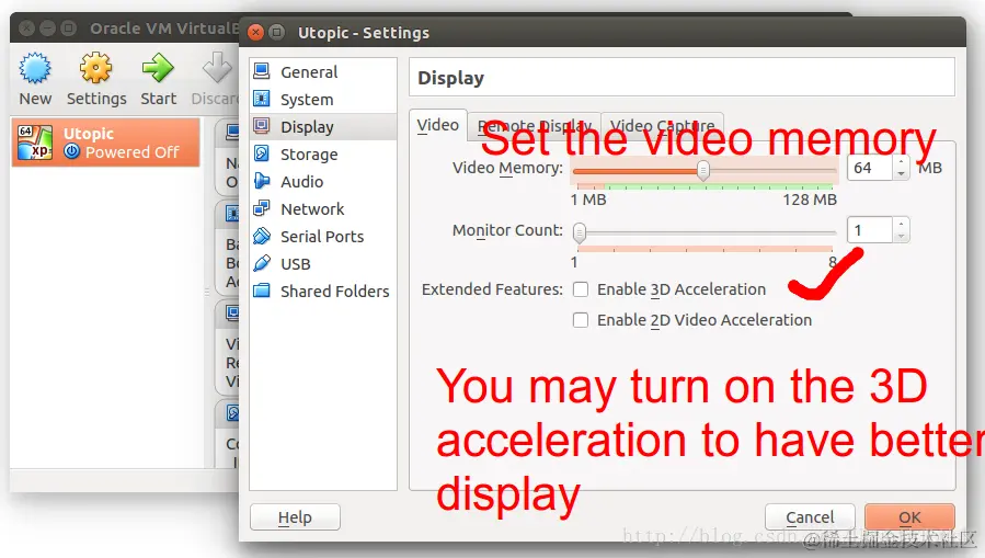 点击VirtualBox的“ Settings”,选择“ Display”进行设置。