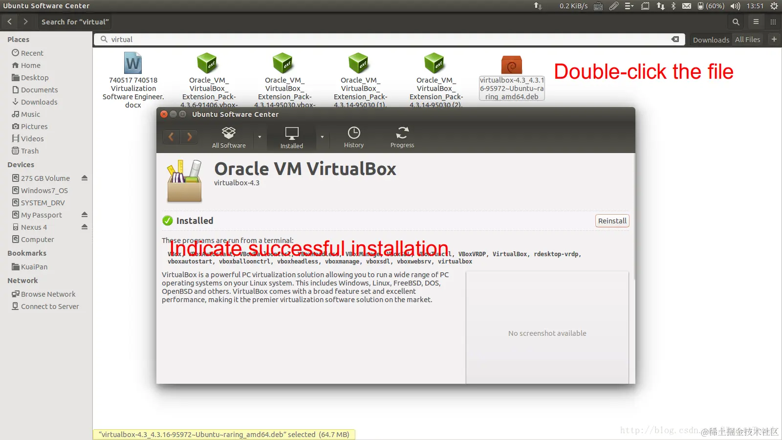 我们在Ubuntu OS或Windows下,双击刚刚下载的VirtualBox文件,系统会自动帮我们调用软件帮我们安装。在Ubuntu OS下的界面如下: