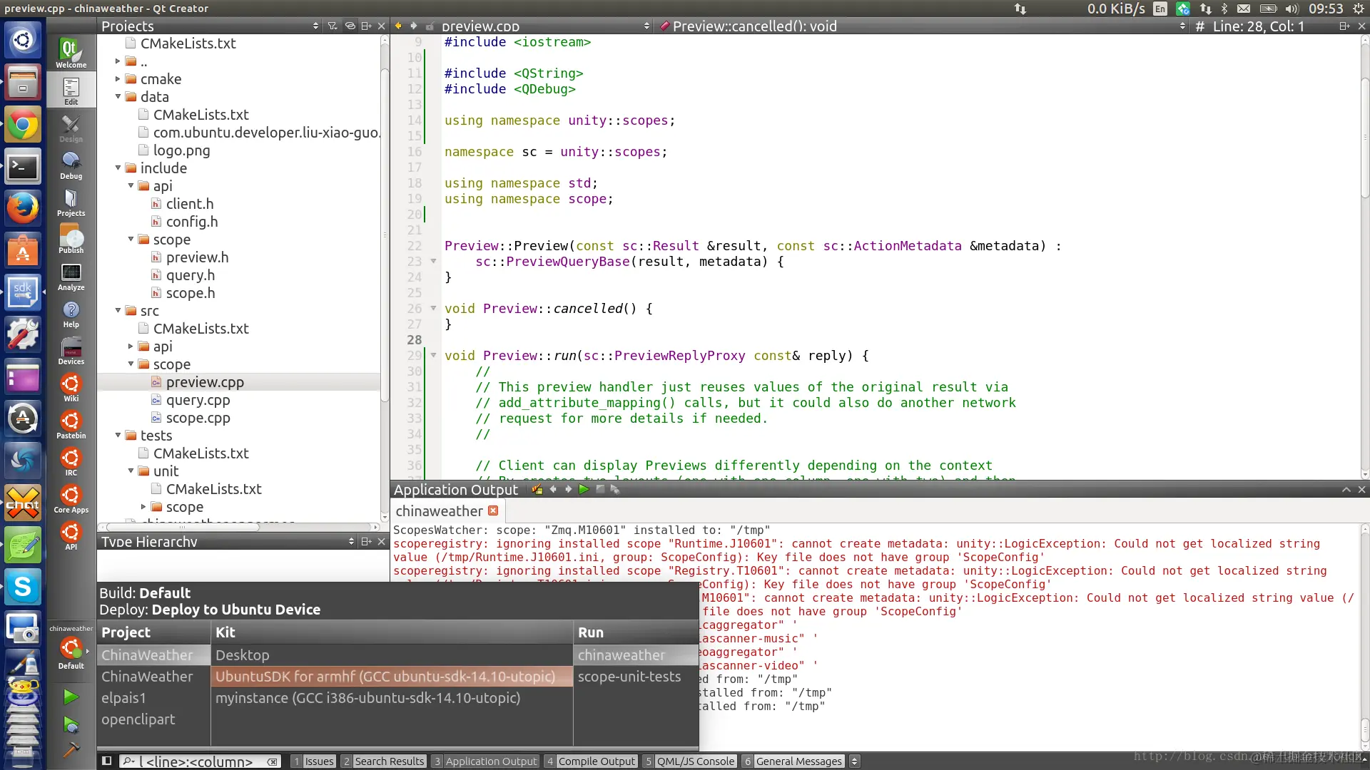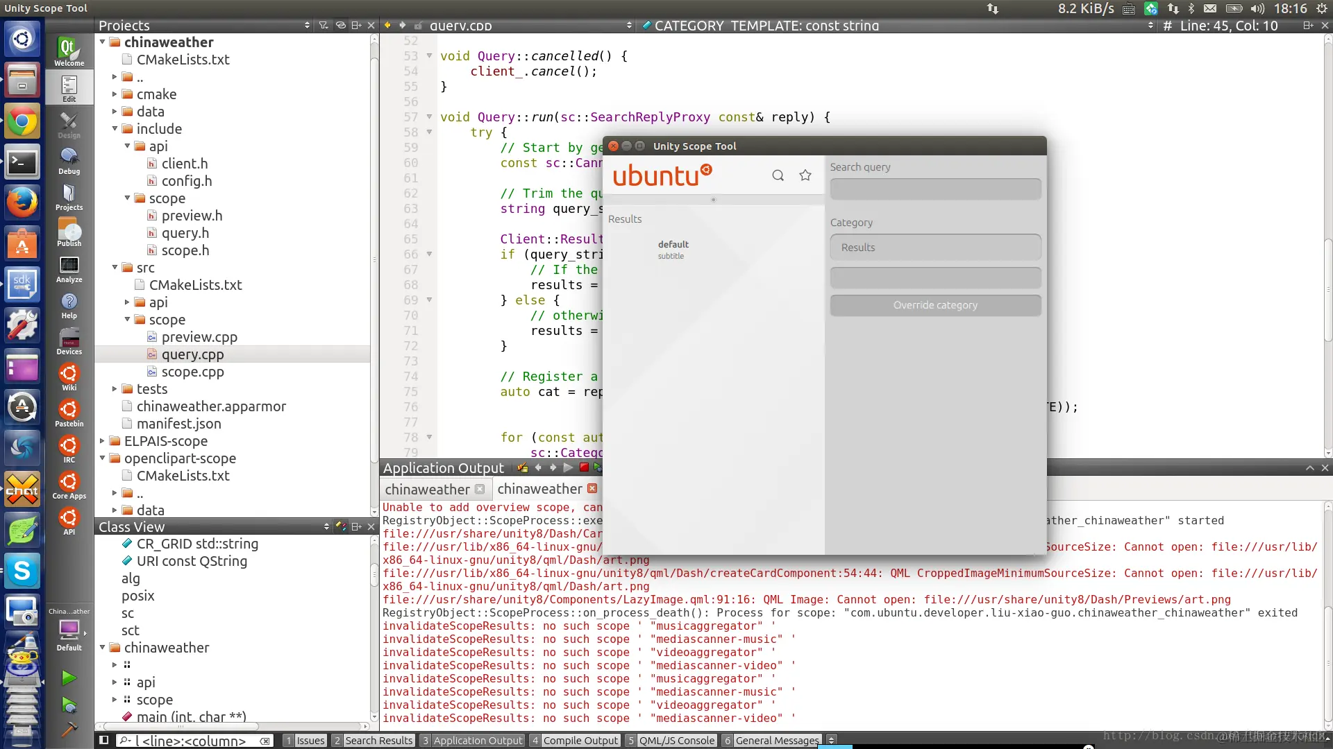 我们再重新编译我们的应用,如果我们没有错误的话,我们的Scope可以直接在desktop下直接运行。这里我们加入了一个”QCoreApplication”变量。这主要是为了我们能够使用signal/slot机制及生成一个Qt应用。我们来修改scope.h文件,并加QoreApplication的变量app及forward申明。我们也必须同时加入一个方法"run"。