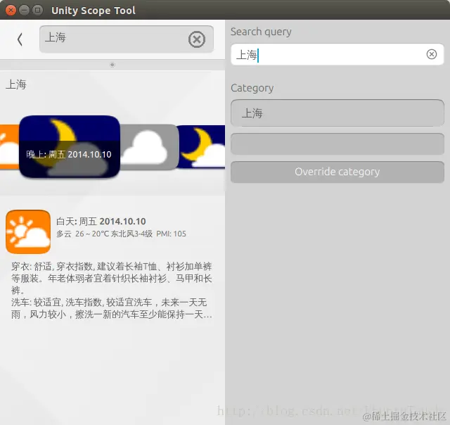 重新编译我们的scope。如果有错误请及时修正。同时在desktop或emulator中运行我们的应用。我们可以看到如下的画面。我们也可以在Unity Scope Tool的输入框中输入"上海",我们可以看到内容会发生变化。
