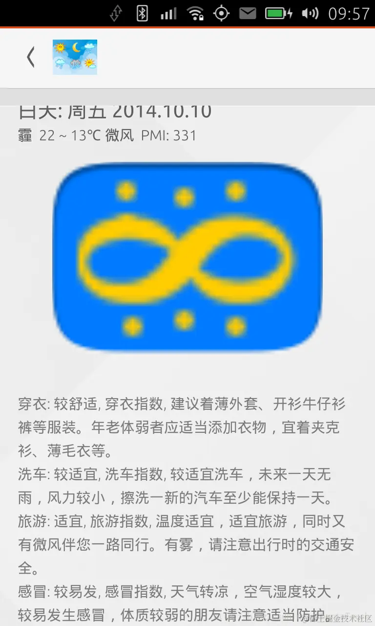我们再重新运行程序,我们可以看到如下的画面。点击左边图下面的小图标,即可看到右边的图的当天的天气的详细情况。