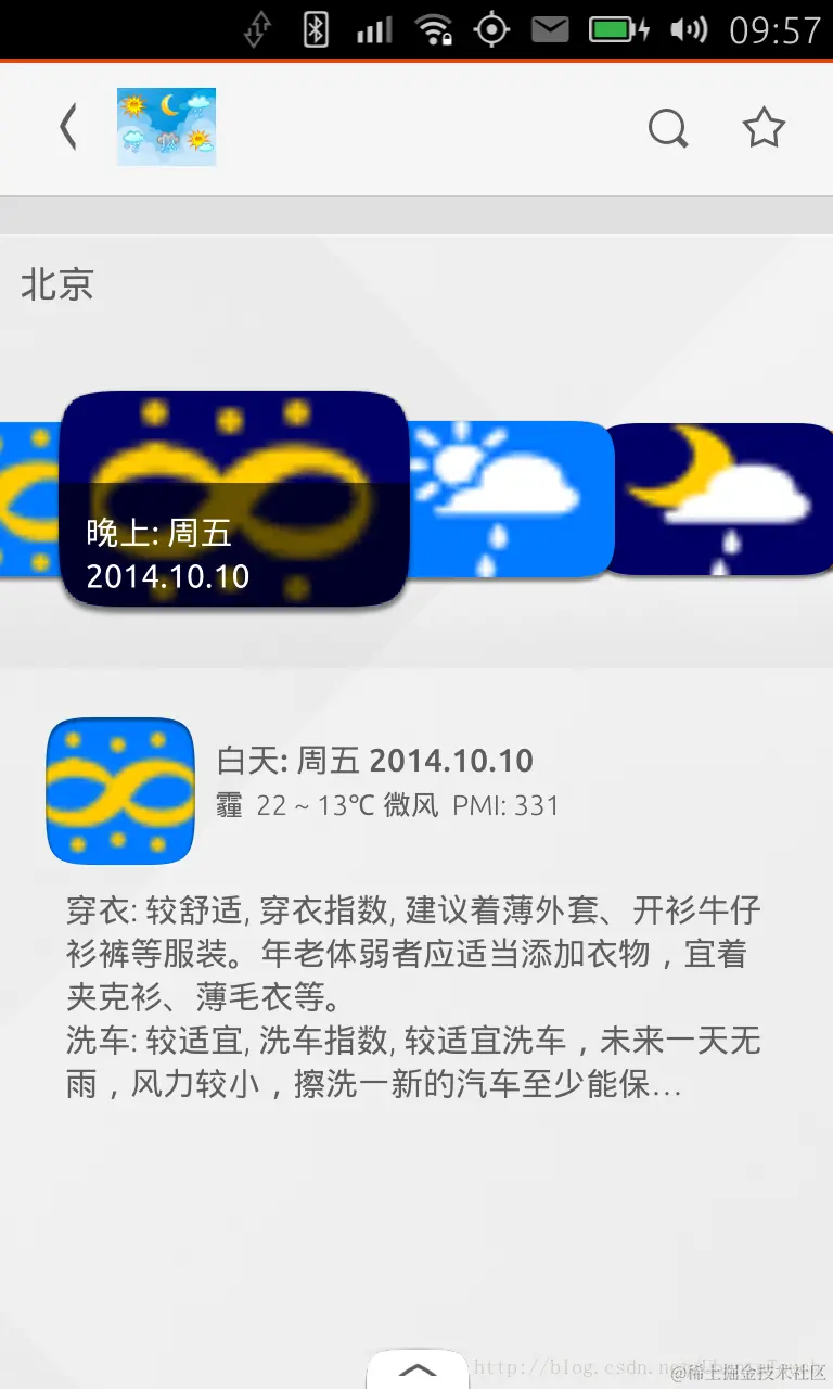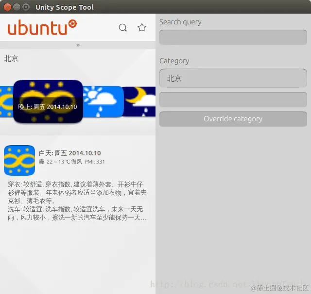 在这篇文章里,我们将使用Ubuntu SDK从零开始来创建一个“中国天气”的Scope应用。通过这个过程,让开发者了解Scope在Ubuntu上的开发流程,以及对Scope有更深的认识。该应用完全使用Qt C++及std C++来完成的。更多关于Scope的知识,可以在网址:developer.ubuntu.com/scopes/。我们开发应用的最终显示图为:
