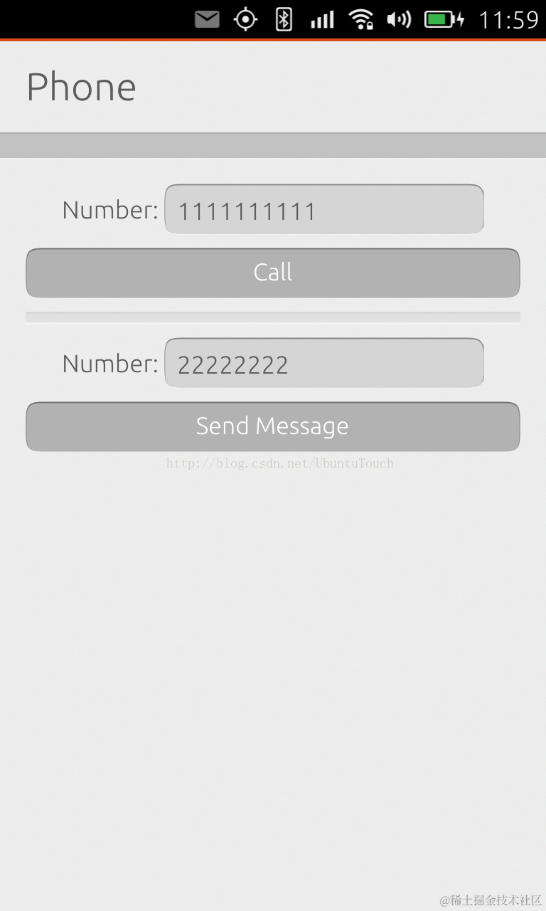 由于一些平台安全性的原因,Ubuntu手机目前暂时没有提供供第三方开发者发送短信及拨打电话的接口,但是在实际的应用中,我们也许会需要用到发送短信息或拨打电话。这个时候我们怎么办呢?我们在前面的文章“使用URL dispatcher的范例”中已经介绍了如何使用url dispatcher来调用第三方应用的方法。这里我们用该方法来展示如何在我们的应用中发送短信息及拨打电话。
