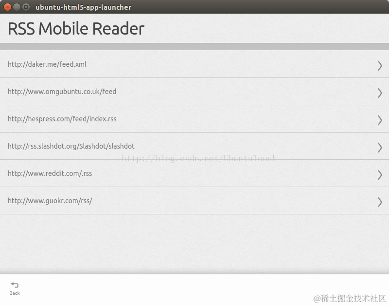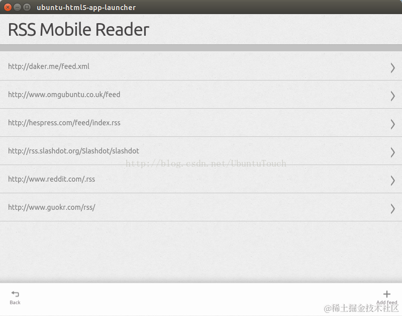 无论你是互联网世界的一个高手或是一个从来没有接触过互联网的新手,这篇文章将给你带来完整的在Ubuntu平台上开发HTML 5的应用。我们将慢慢地通过这个练习让你很自然地进入并熟悉整个的HTML 5应用的开发流程。在这个练习中,我们将设计一个最简单的RSS阅读器。当我们的应用设计完整后,应用的显示如下: