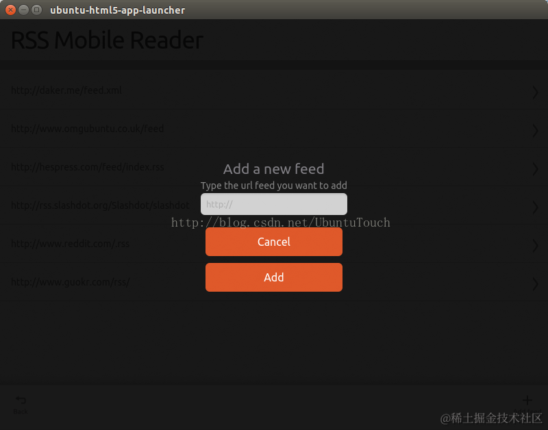 这里我们定义了一个叫做“addfeeddialog”的对话框。它让用户来输入一个RSS feed的url。