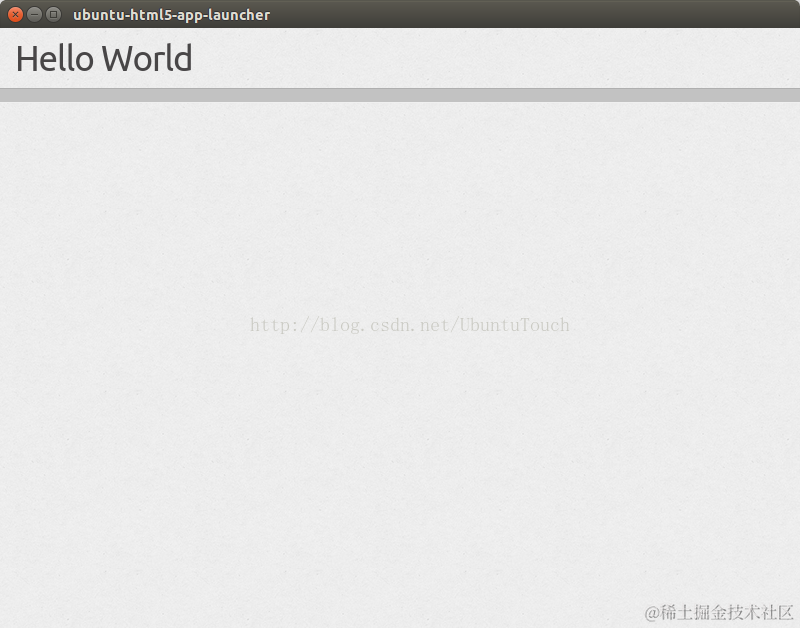UbuntuUI是Ubuntu HTML 5应用的一个关键的架构类。我们需要构造它并初始化它以生产我们需要的Ubuntu HTML 5应用。我们可以通过这个对象来方位Ubuntu HTML 5的对象(对应于Ubuntu DOM元)及方法。到目前位置,这是我们最基本的一个最小的一个HTML 5应用虽然没有任何的东西。运行我们的应用,我们可以看到: