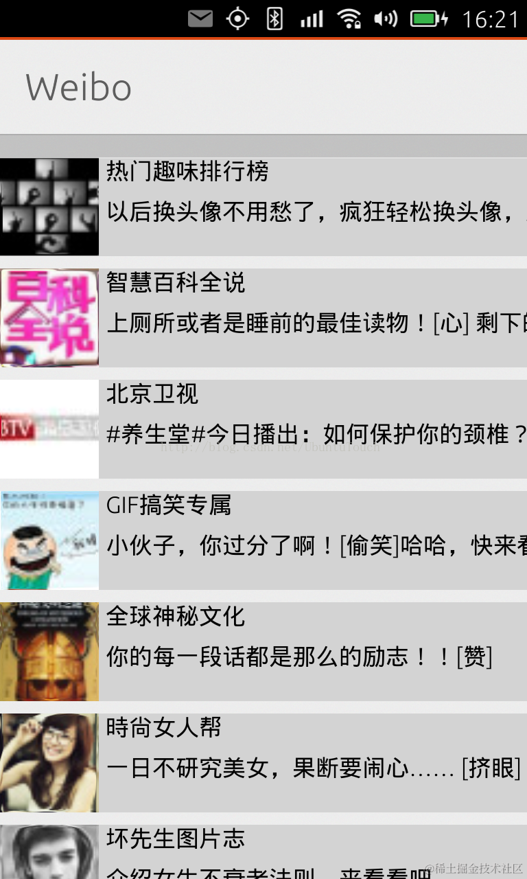 - 使用另外一个ListView (weiboList)列表来显示微博的内容