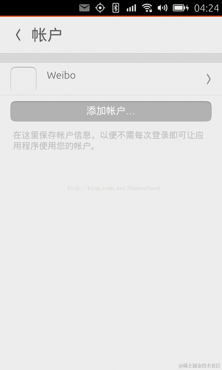 - 使用一个ListView (accountsList)来显示所有我们相关的账号。这个可以在“系统设置”中的“账号”可以看到